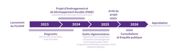 Nous ne sommes qu’au début de la démarche. La nature du Plan Local d’Urbanisme intercommunal Habitat et Mobilité (PLUiHM) et les enjeux et objectifs qu’il devra transcrire nécessitent de prendre le temps nécessaire à sa construction. Ainsi, différentes étapes se succèderont pour aboutir à une approbation en 2026.